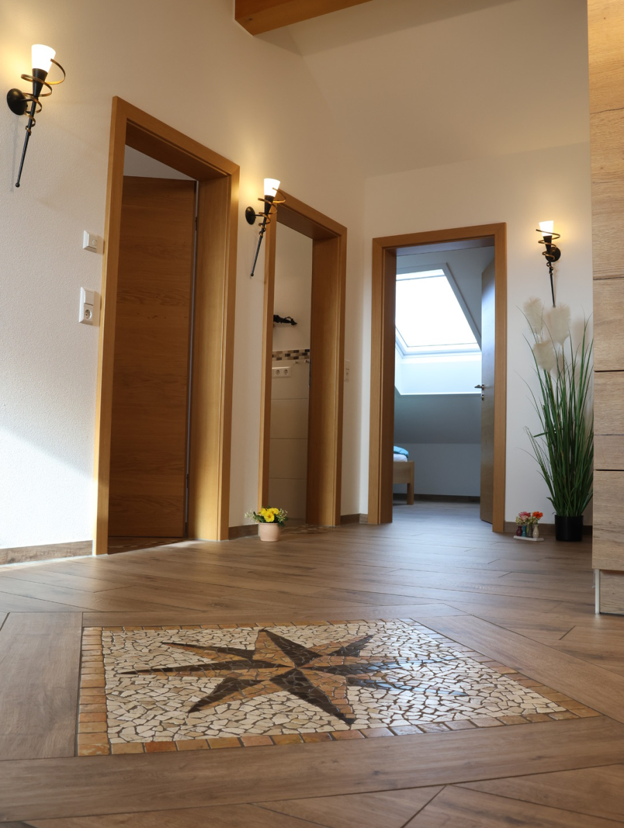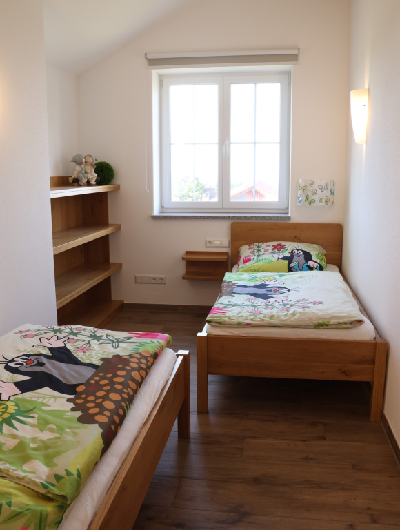 Kinderschlafzimmer mit zwei Einzelbetten mit Blick soweit das Auge reicht in die beruhigende Naur der Wälder und Wiesen und auch