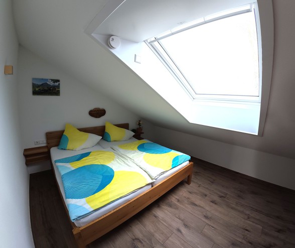 Elternschlafzimmer mit einem Dachfenster mit Rollladen