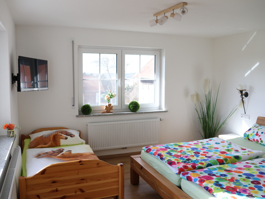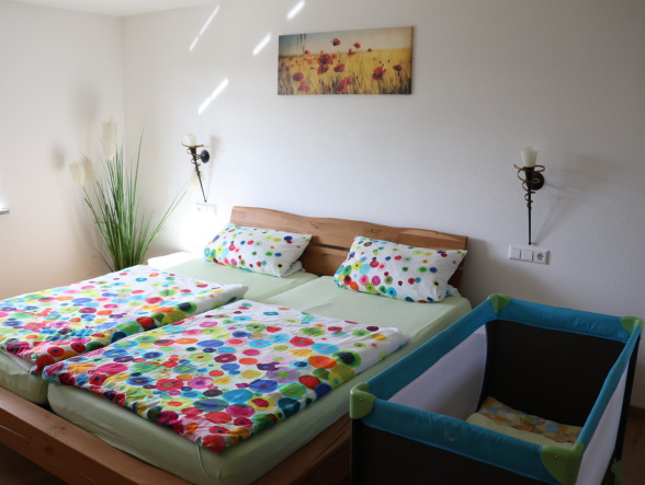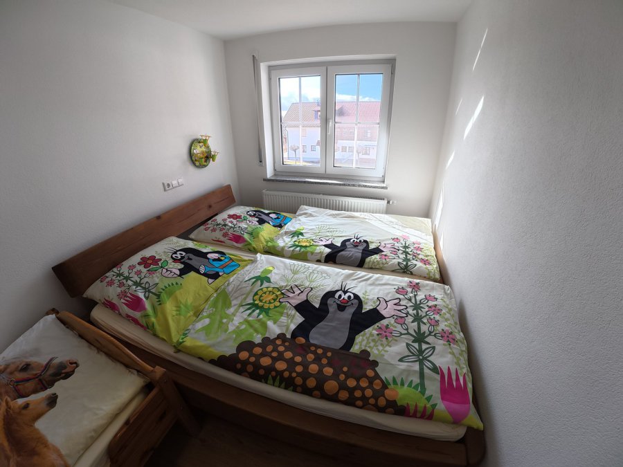 Im Kinderzimmer befindet sich ein Ehebett und ein Einzelbett