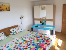 Im Elternschlafzimmer befindet sich ein Ehebett - ein Einzelbett sowie ein Reisebett - sie haben einen herrlichen Blick in die Alpenkette.