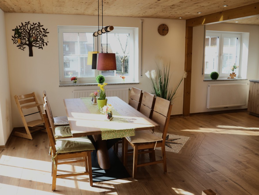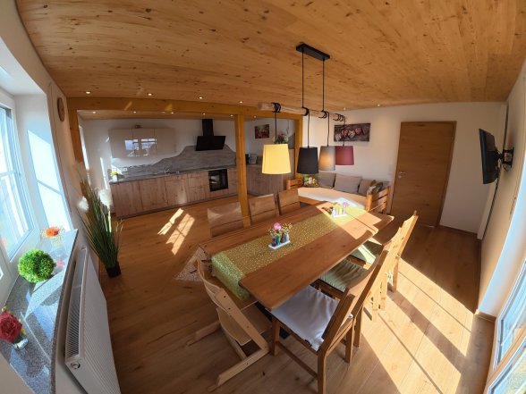 Ein lichtdurchflutetes Wohnzimmer - Blick in Richtung Hofgelände und ein Panoramafenster in Richtung Alpenkette - macht das Frühstück zu einem unvergesslichen Erlebnis. Vor dem Ferienhaus Edleweiß befindet sich eine Terasse mit Sitzmöglichkeit